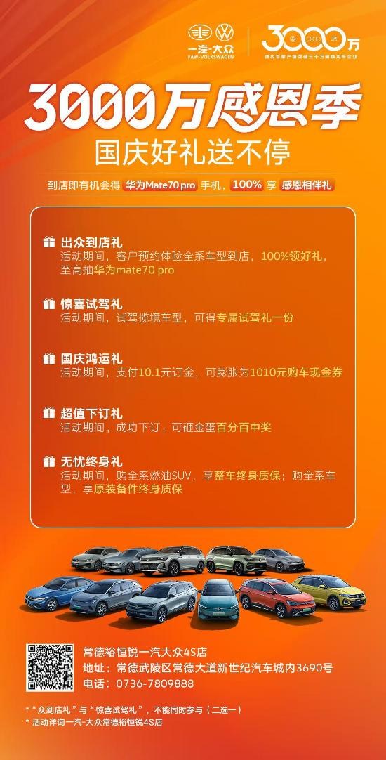 无需犹豫,到店即享惊喜——只要预约体验全系车型,100%能领好礼,更有机会抽取至高奖励华为Mate70 Pro!这个双节,别让福利溜走,常德一汽大众裕恒锐4S店,满心期待您的到来!
