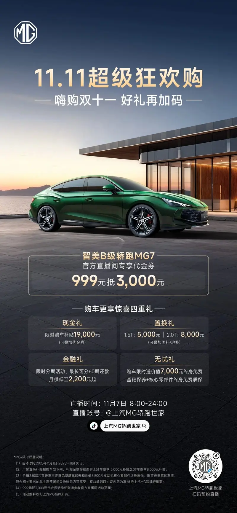 同时,MG7 限时享999元抵3000元代金券,购车更可享受惊喜四重礼。
