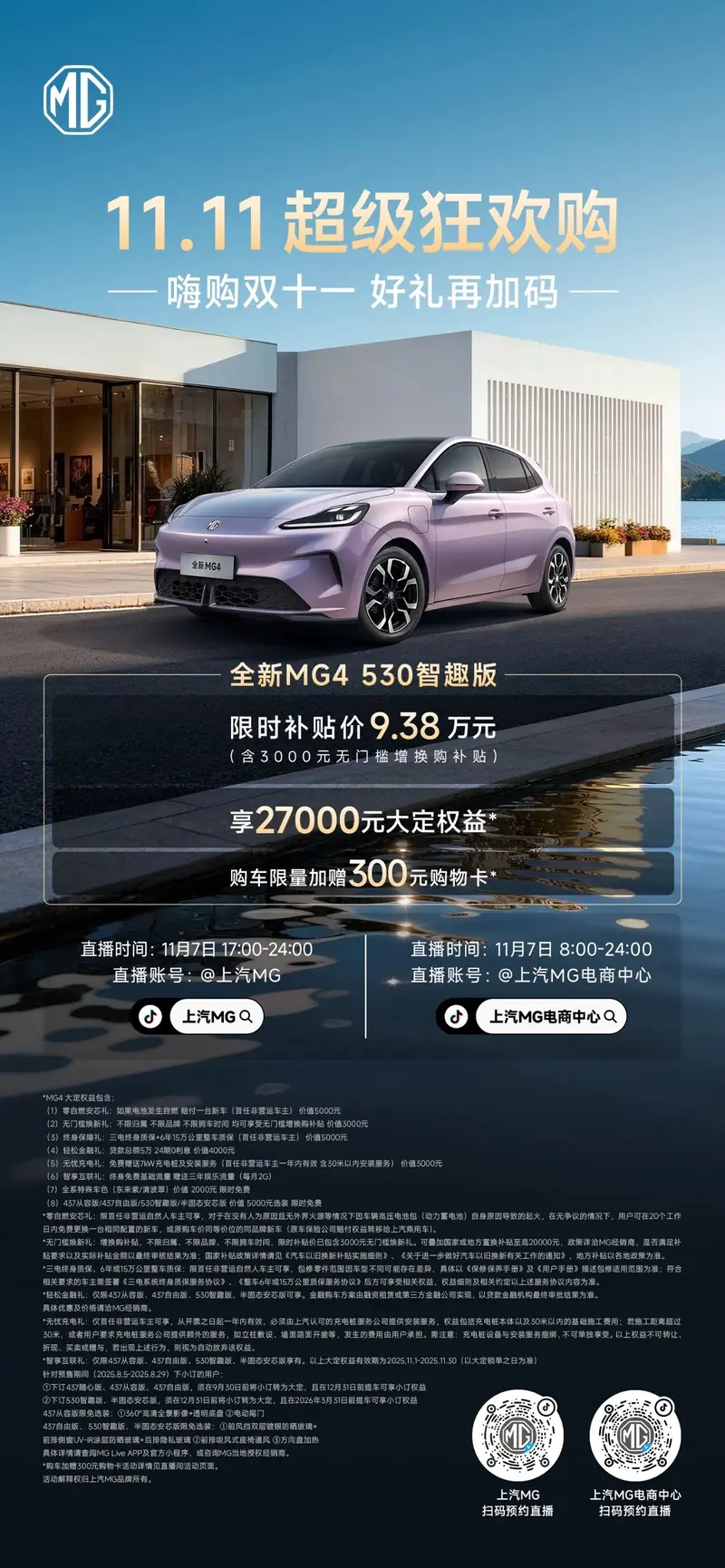 11月7日,上汽MG官方宣布推出双十一超级狂欢购钜惠,全新MG4 530智趣版可享受2.7万元大定权益+限量300元购物卡。