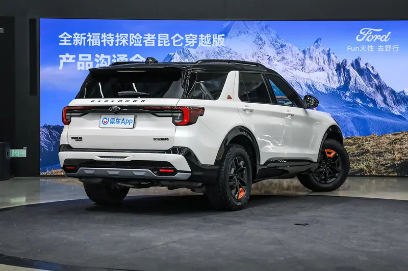 福特探险者昆仑穿越版5座是为深度户外爱好者及实用主义打造的,新车采用了双色车身设计,车头配备了橙色可负重3吨前双拖钩设计、前脸与后保皆添加金属挡板设计,视觉上更添。力量感