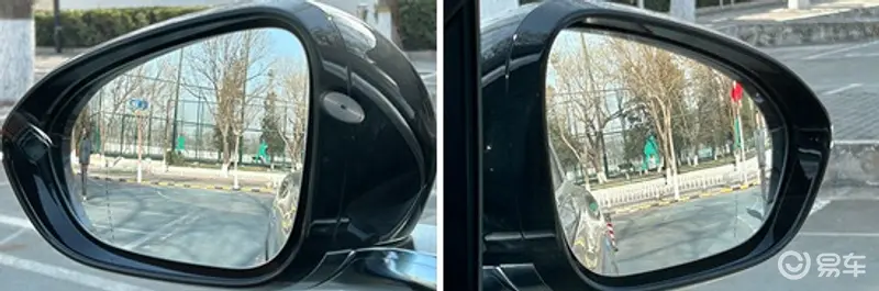 评测车的左/右外后视镜均采用双曲率镜片,经实测,左、右外后视镜视野范围分别为28.5°和21.6°,在测试过的同级别车型中分别处于中上游和中游水平。