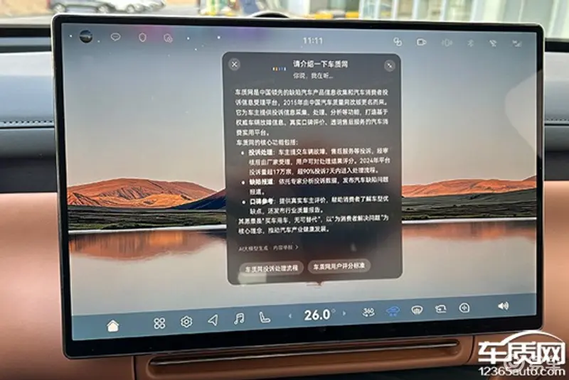 经过实测,系统可以正确执行“打开副驾车窗”和指着副驾车窗说“打开这个”指令,且反应速度较快。对于“我有点饿了”和“我有点不太舒服”的指令,系统无法进行回应。对于“导航到北京站东街”这样容易混淆的复杂指令,系统能够排除干扰正确理解。对于“导航到附近大众点评得分4.5分以上的川菜馆”指令,系统则无法进行回应。智能交互方面,系统可以正确执行“岚图泰山都有哪些亮点?哪款配置性价比最高?”和“请介绍一下车质网”指令,并通过语音播报和屏幕文字显示两种方式给出相应的答案。此外,评测车支持四区域语音唤醒识别、语音免唤醒词、可见即可说和语音连续识别,便利性表现较好。