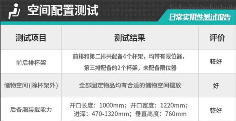 经过实测,全部固定物品均有合适的储物空间进行摆放,并且位置设计比较合理,拿放物品方便。同时,评测车中控台下方的储物槽空间较大,进一步提升了实用性。