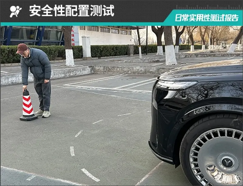 在前方视野测试中,我们采用高70cm的桩桶作为参照物,随后调整车距,直至在主驾驶位可以看到桩桶上沿。经过测试,桩桶与车头最终测得的数据为3.255m,在测试过的同级别车型中处于中下游水平。