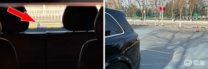 后方视野测试中,依旧将桩桶固定摆放,随后移动车辆直至可以观察到桩桶上沿为止。经实测,评测车后方视野所测得的距离为11.425m,在测试过的同级别车型中处于上游水平。