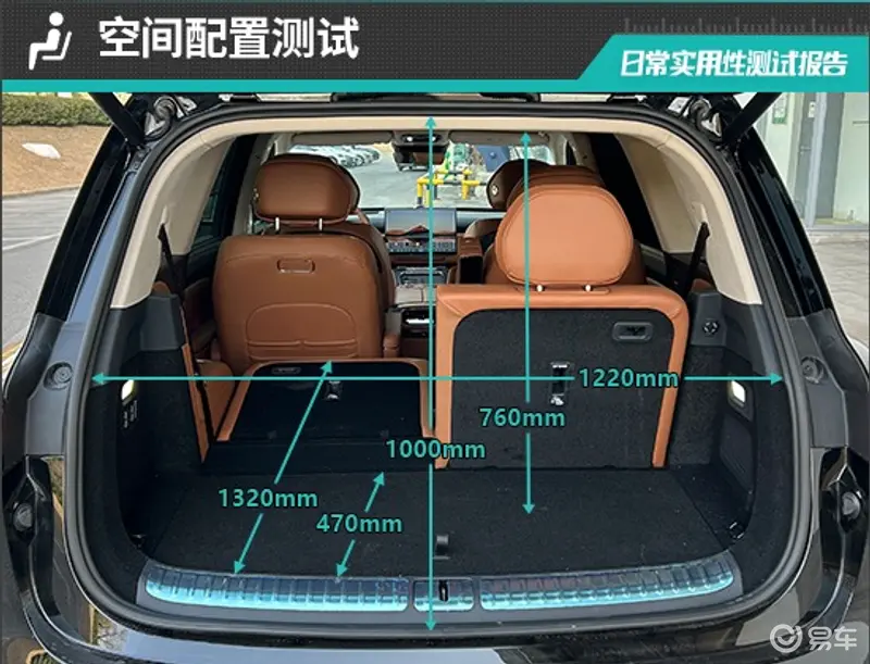 后备厢内部造型较为规整,地板平整度不错。第三排座椅支持比例放倒,放倒后可以进一步拓展后备厢空间。对于评测车的后备厢基础数值,我们也进行了实测,开口长度为1000mm;开口宽度为1220mm;后备厢进深为470-1320mm;后备厢地台与顶部的垂直高度为760mm。