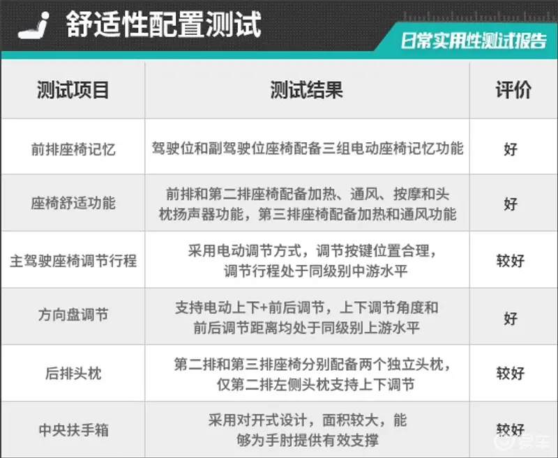 座椅方面,评测车前排座椅调节按键位于座垫侧面,调节按键位置合理,操作便捷。此外,评测车驾驶位和副驾驶位座椅配备三组电动座椅记忆功能;同时,前排和第二排座椅提供加热、通风、按摩和头枕扬声器功能,第三排座椅配备加热和通风功能,舒适性表现出色。