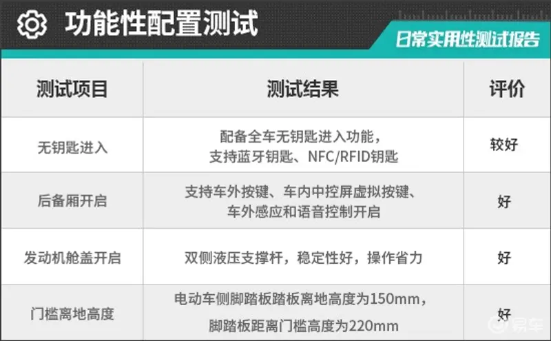 对于消费者来说,门槛离地高度一定程度上决定了上下车便利性。根据实测结果来看,评测车带有电动车侧脚踏板,脚踏板离地高度为150mm,脚踏板距离门槛高度为220mm,驾乘人员日常上下车很方便。