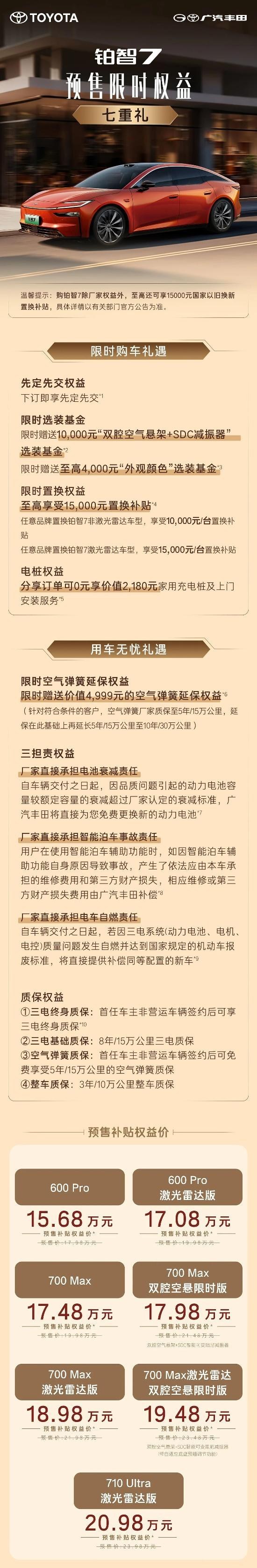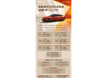 广汽丰田铂智7 将于3月29日迎来正式上市。铂智7已于3月5日开启预售,包含五款车型,预售权益价区间15.68-20.98万元。新车定位中大型纯电动轿车,配备满血版鸿蒙座舱、智能预瞄双腔空悬、Momenta R6智驾辅助及双电机零重力座椅等配置。