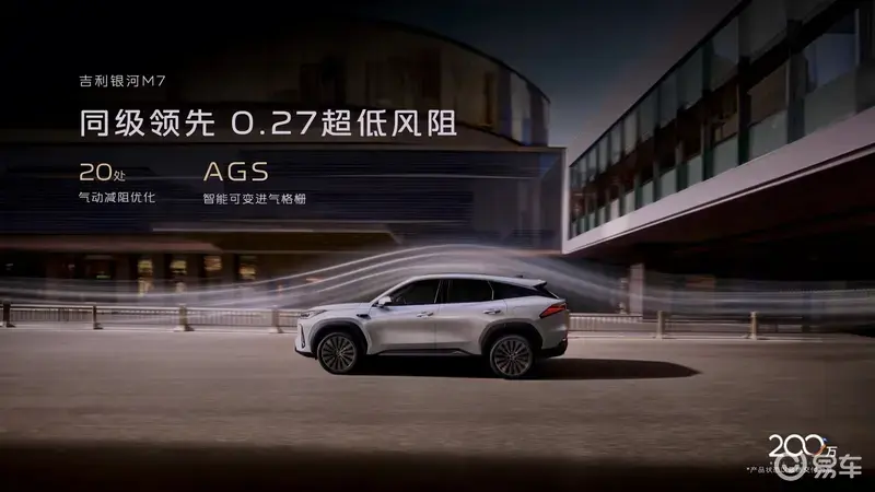 外观方面,吉利银河M7采用了最新的家族设计语言,“飞檐虎视”的前脸设计与“星汉涟漪”贯穿灯极具辨识度,尤其灯组跨度超过两米,内含362颗LED与500个激光镭雕细节。两侧的导流槽还加入了精致的镀铬装饰,提升了前脸的质感。