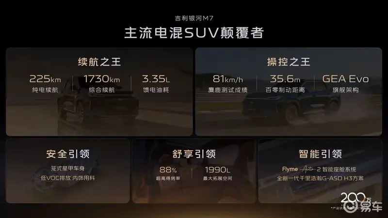 们从吉利银河官方获悉,吉利银河M7 ( 参数 | 询价 | 图片 ) 将于4月上旬开启预售,下旬正式上市。吉利银河M7此前已正式亮相,作为吉利银河M系列首款中级电混SUV,新车拥有225km的纯电续航以及1730km的综合续航