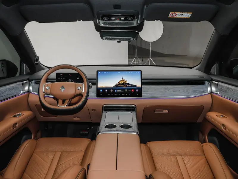 内饰方面,华境S提供象牙米和檀香棕两种配色方案,通过冰玉纹缝线、温雅竹韵雕饰以及鎏金纹饰条等细节,构建出沉浸式的奢享座舱环境。车内采用大面积软包内饰,环抱式设计搭配平直的中控台线条、全液晶仪表以及悬浮式中控屏,整体布局简约规整,功能分区清晰,操作便捷。