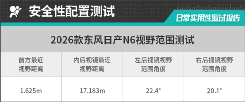 评测车的左/右外后视镜均采用普通镜片,经实测,左、右外后视镜视野范围分别为22.4°和20.1°,均处于同级别中游水平。