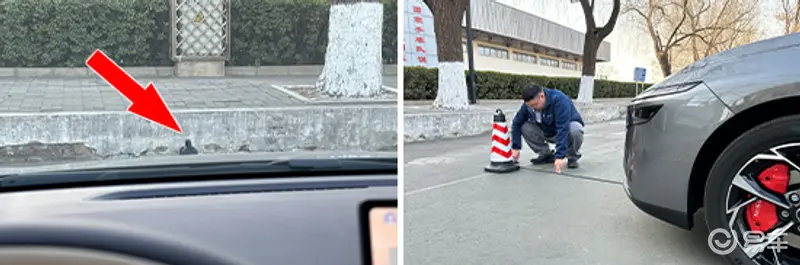 在前方视野测试中,我们采用高70cm的桩桶作为参照物,随后调整车距,直至在主驾驶位可以看到桩桶上沿。经过测试,桩桶与车头最终测得的数据为1.625m,在测试过的同级别车型中处于上游水平。