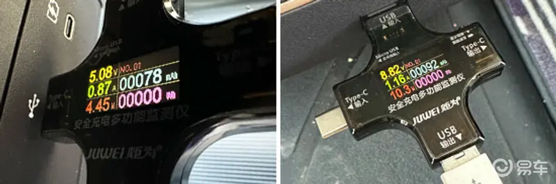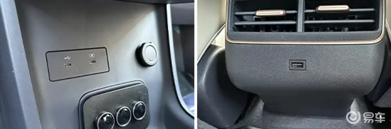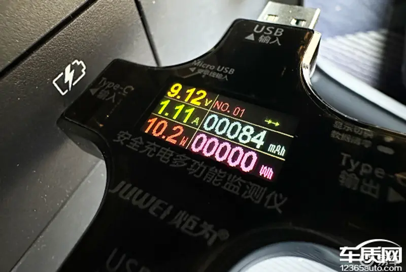 在车内USB接口方面,评测车前排配有2个USB Type-C接口,后排配有1个USB Type-A接口。我们对USB接口进行了测试,前排左侧USB Type-C接口的测试成绩在5.08V、0.87A、4.45W左右;右侧USB Type-C接口的测试成绩在9.12V、1.11A、10.2W左右;后排USB Type-A接口的测试成绩在8.82V、1.16A、10.3W左右。此外,评测车还配备1个12V电源。