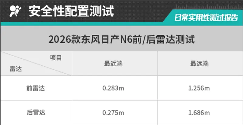 前驻车雷达最远可在1.256m处感应到前方物体,雷达功率表现出色,最近端提示距离为0.283m,表现同样达到同级别车型平均水平。