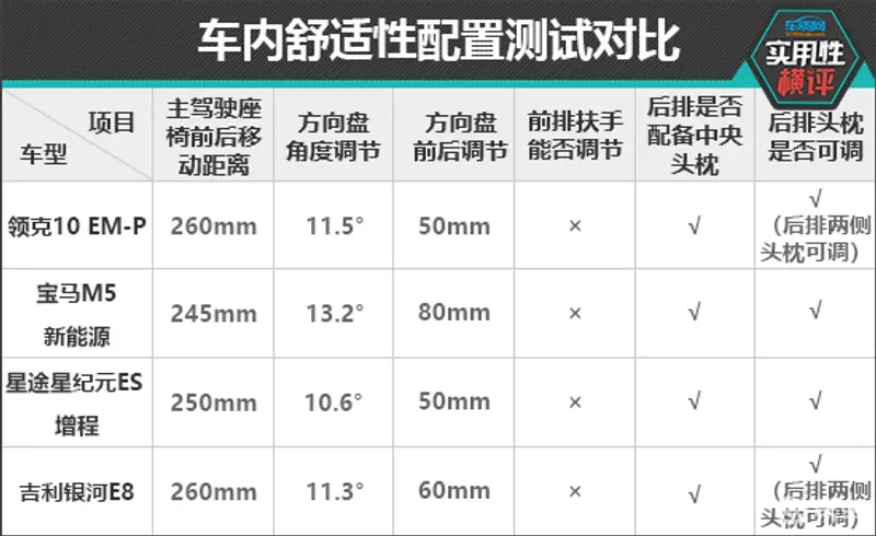 主驾驶座椅前后移动距离方面,领克10 EM-P和吉利银河E8表现相对较好,测试数值均为260mm,宝马M5新能源测试成绩垫底。方向盘调节方面,宝马M5新能源扳回一城,以较大优势胜出,其上下可调节角度和前后可调节距离均达到同级别上游水平。相比较而言,星途星纪元ES表现中规中矩,其方向盘上下可调节角度仅为10.6°,略逊于另外三款车型。