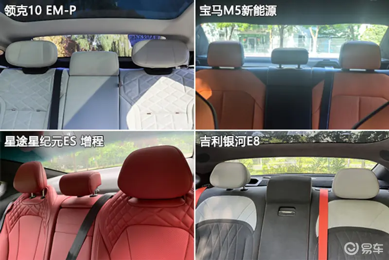 车内舒适性方面,四款车型后排均配备三个独立头枕,整体表现令人满意。其中,星途星纪元ES的后排中间头枕尺寸略小于两侧头枕,但对枕靠舒适性影响不大。而吉利银河E8由于后排中间头枕内部填充物较硬,枕靠舒适性与两侧头枕存在较大差距。此外,领克10 EM-P和吉利银河E8的后排中间头枕均不支持高低调节,功能性方面略逊一筹。