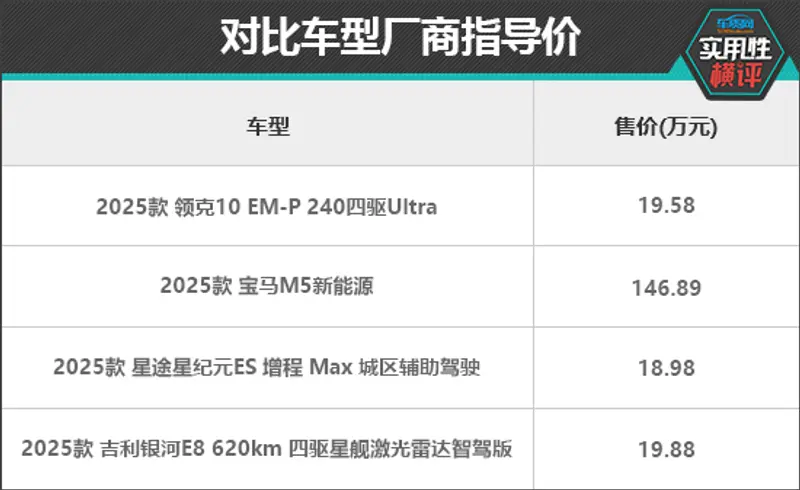 近年来,自主品牌凭借新能源和智能化技术实现了对海外品牌的弯道超车,从具体市场表现来看,中大型车细分市场无疑成为了自主品牌争夺的焦点。自主品牌新能源车型通过与海外品牌同台竞技,加速推动了国内轿车市场的高端化转型。在往期的《日常实用性测试》中,我们曾测试过多款高人气中大型车。本次,我们将选取领克10 EM-P、宝马M5新能源、星途星纪元ES 增程(以下简称:星途星纪元ES)、吉利银河E8四款车型,通过横向对比,看看哪款车型的实用性表现更加全面。