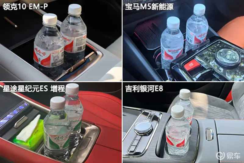 杯架测试环节,吉利银河E8全车提供6个杯架,数量相对较多,另外三款车型的杯架数量均为4个。值得肯定的是,四款车型前后排杯架均带有限位器,可以有效固定水杯或水瓶。