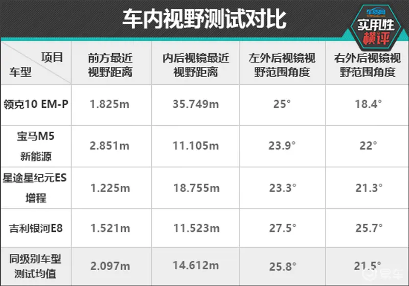 实测过程中,除宝马M5新能源外,另外三款车型的前方视野成绩都优于同级别车型测试均值,星途星纪元ES以1.225m的测试成绩排名第一。在内后视镜最近视野距离测试中,宝马M5新能源和吉利银河E8表现更为出色,测试成绩均达到同级别车型上游水平,而领克10 EM-P测试成绩垫底,后方视野盲区较大。