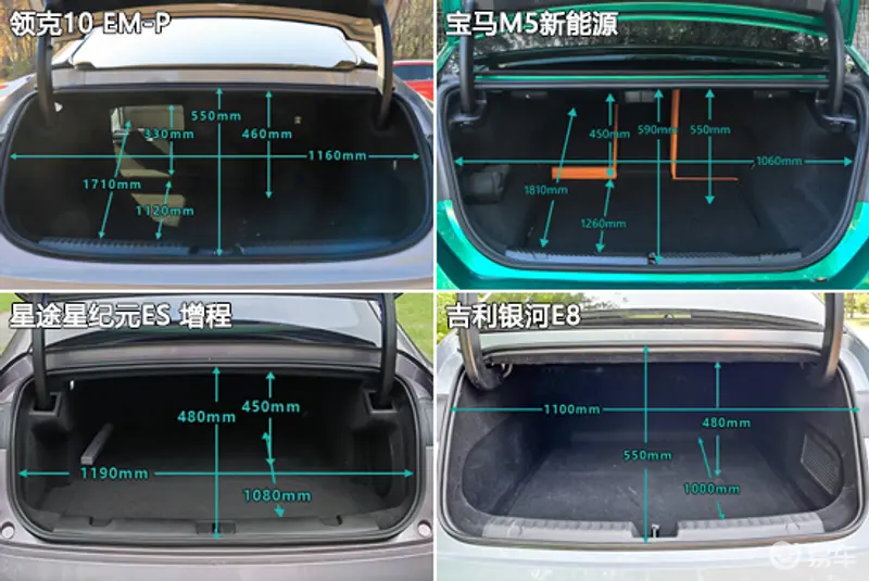 后备厢方面,四款车型的内部造型均较为规整。实测来看,领克10 EM-P和星途星纪元ES整体表现较好,分别有两项数值超过了同级别车型测试均值。相比之下,吉利银河E8所有测试数值均未达到同级别车型测试均值,存在提升空间。