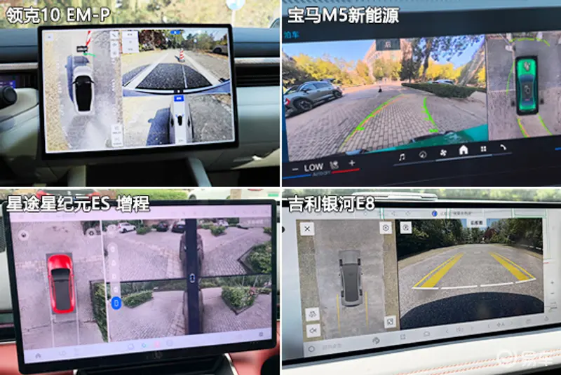 在影像辅助系统方面,四款车型均配备360度全景影像系统,支持多角度查看,并且畸变控制合理。同时,影像画面内还提供可随动转向的倒车辅助线,能够为驾驶员提供有效参考。