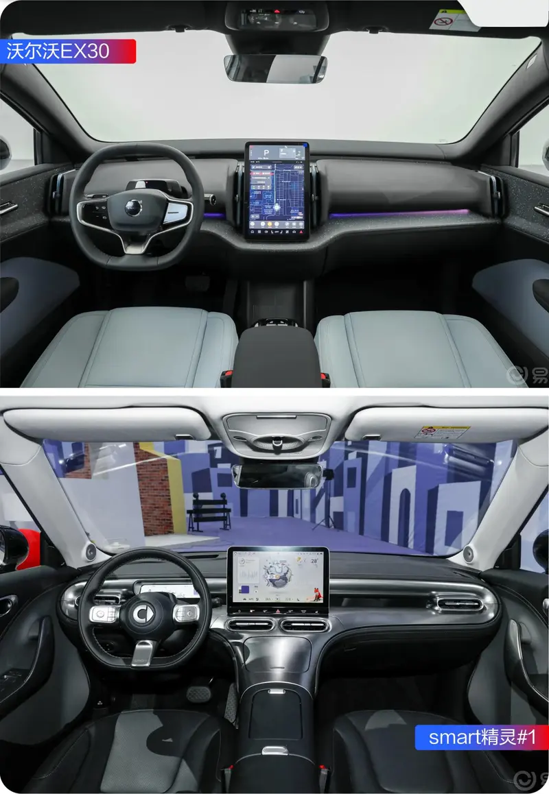 步入车内,沃尔沃EX30依然秉持纯粹的斯堪的纳维亚设计语言,以极简线条勾勒出清新雅致的时尚格调。在延续传统豪华质感的同时,座舱巧妙融入亚麻纤维、单宁面料等环保材质,通过特殊工艺精制而成,无论是在强度、质感还是触感上都表现出色,赋予豪华全新的可持续内涵,营造出别具一格的高级氛围。而smart精灵#1则采用经典的T型中控布局,搭配柔和流畅的曲面与圆角处理,整体视觉温润和谐,尽显精致与亲和力。
