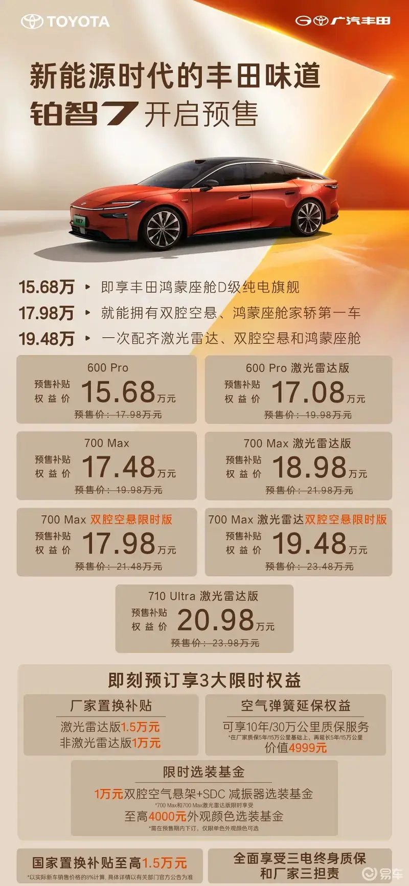 预售期间官方推出限时三大预售权益,限时置换补贴主要针对激光雷达版提供1.5万元厂家置换补贴,非激光雷达版提供1万元补贴;限时选装基金,含1万元空悬选装基金和至高4000元车色选装,最高1.4万元;限时免费空气弹簧延保权益,基础质保之上再加码,价值4999元,叠加后铂智7双腔空悬质保服务长达10年或30万公里。