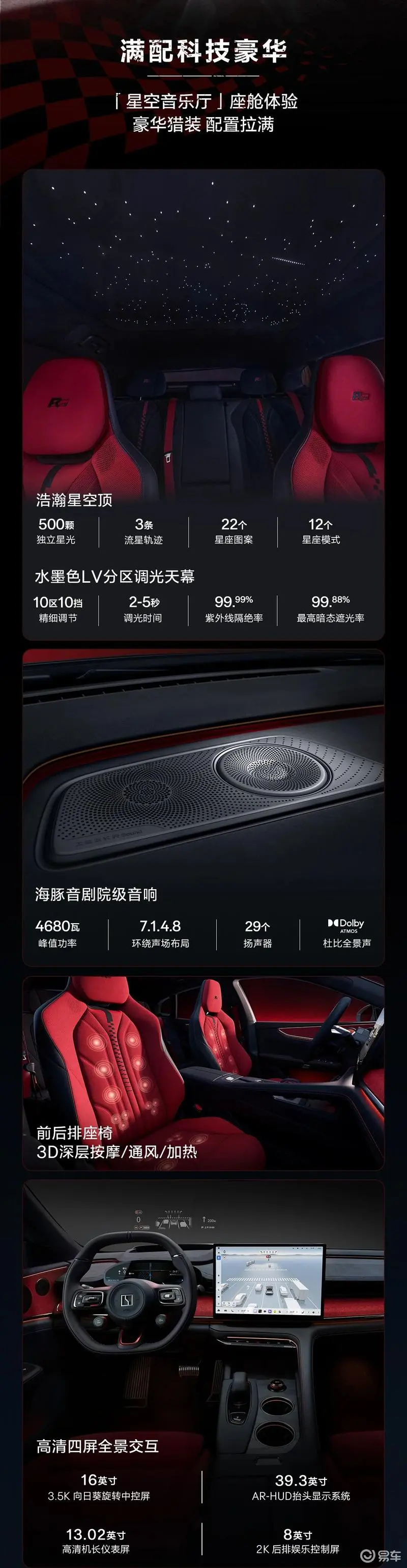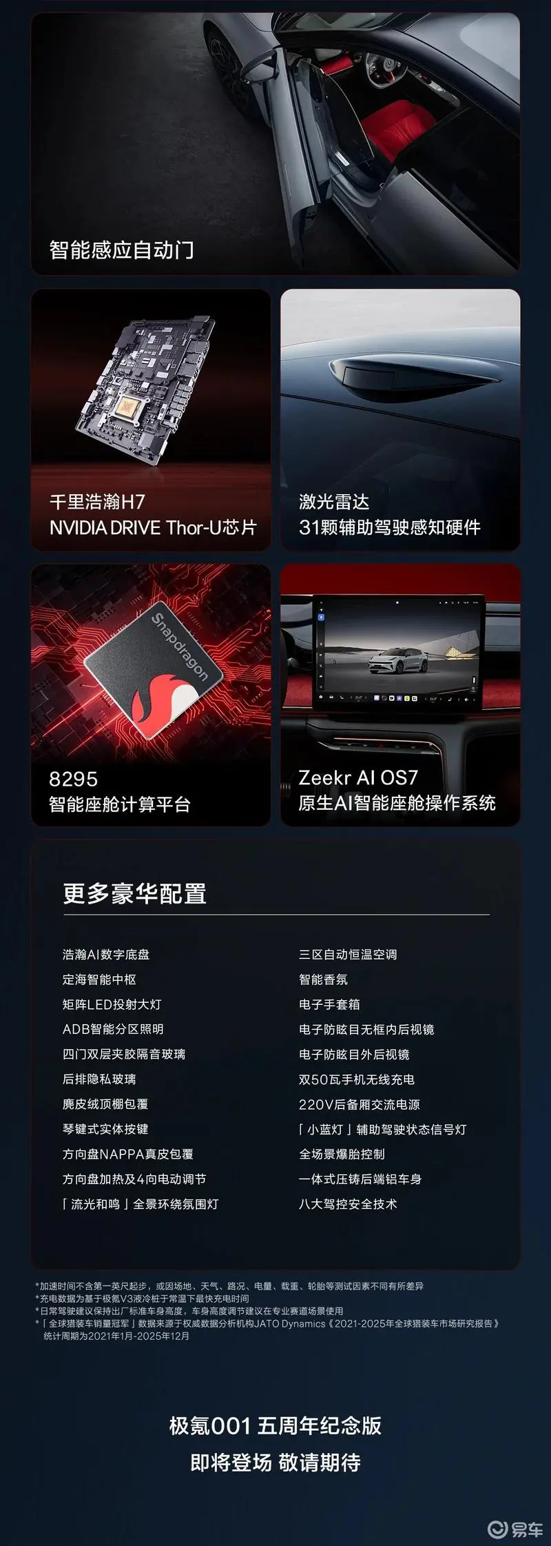 座舱智能与豪华配置层面,极氪001五周年纪念版配备定制星空音乐厅座舱组合,搭载浩瀚星空顶、水墨色LV分区调光天幕,以及4680瓦29扬声器7.1.4.8全景声音响系统。车辆同步搭载Zeekr AI OS 7原生AI智能座舱与千里浩瀚H7 G-ASD辅助驾驶系统,匹配领先的智能出行硬件配置。