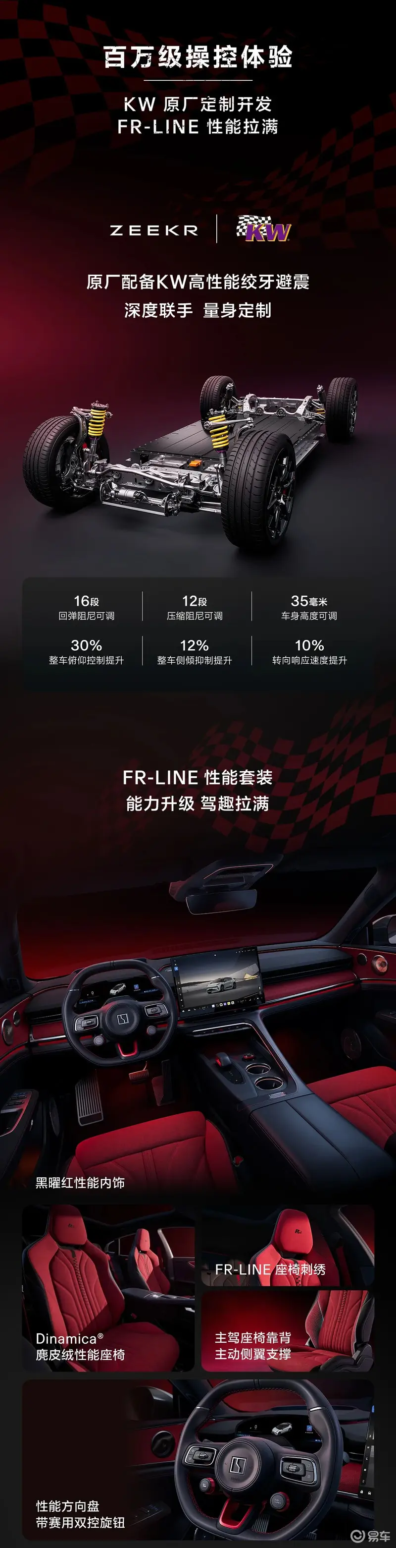 底盘驾控层面,极氪001五周年纪念版是百万级售价区间内,市面唯二原厂标配KW高性能绞牙避震的车型。KW避震器多用于高端跑车及F1、WTCC等专业赛事场景,支持16段回弹、12段压缩阻尼调节,车身可调高度可达35mm,针对车辆俯仰抑制、转向响应均完成专项优化调校。极氪携手德国KW专业团队历时三年开展多轮整车适配标定,依托7-POST RIG赛车级专业台架完成200余项精密参数匹配调试,整套底盘调校参照高端车型标定标准,达到扎实稳定的行驶质感。