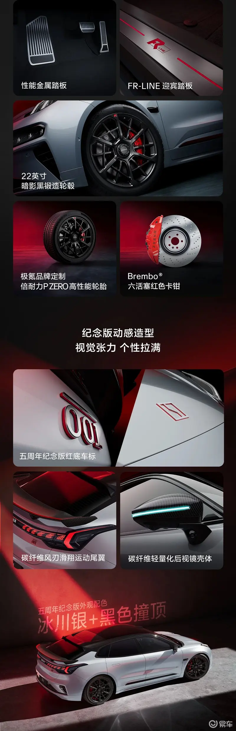 外观方面,新车配备了五周年专属红底车标,提供冰川银车身配色搭配撞色车顶,并搭载FR-LINE性能套件,性能金属踏板、FR-LINE迎宾踏板、22英寸暗影黑锻造轮毂、极氪品牌定制倍耐力PZERO高性能轮胎、Brembo六活塞红色卡钳,动感造型,视觉张力与个性拉满,区分常规版本视觉特征。
