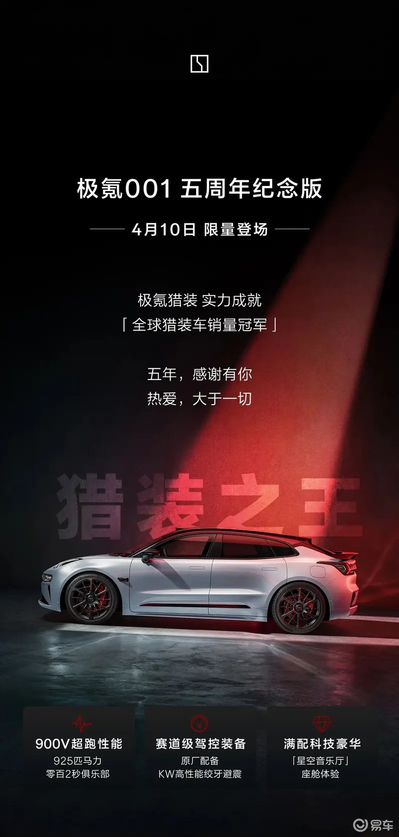 4月3日,极氪汽车官方宣布,极氪001五周年纪念版开启限量预售。新车为极氪品牌五周年之际特别推出的限定版本,将搭载900V纯电平台架构、KW高性能绞牙避震,星空音乐厅座舱。新车将于4月10日正式上市。
