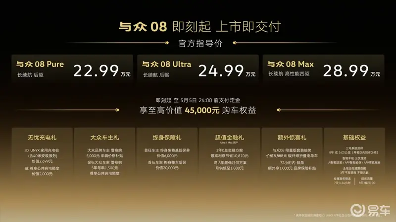 4月16日,大众与众08正式上市,售价22.99-28.99万元。与众08是大众汽车与本土合作伙伴小鹏汽车联合开发的首款车型,车长达到5米,轴距达到3030mm。