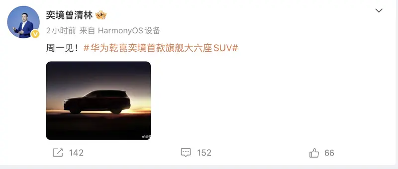 4月17日,奕境汽车品牌总经理曾清林在社交媒体上发布了一张奕境首款旗舰大六座SUV预告图,并表示“周一见”,这就是说奕境首款旗舰大六座SUV将于4月20日发布。结合此前的消息,奕境首款旗舰大六座SUV也会亮相4月24日开幕的北京车展。