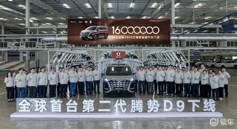 4月17日,比亚迪汽车官方宣布,比亚迪第1600万辆新能源汽车在长沙工厂迎来下线。第二代腾势D9成为第1600万辆下线车型,这也是全球首台第二代腾势D9下线。
